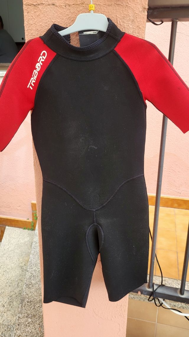 Detalles del productoTraje de neopreno corto para niños de la marca Tribord, talla 6 años. Es de color negro y rojo.