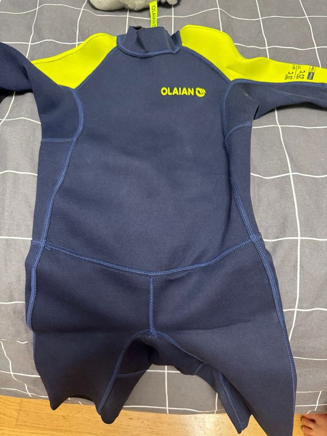 Detalles del productoNeopreno de la marca Olaian, ideal para actividades acuáticas. Presenta un diseño bicolor en azul marino y amarillo.