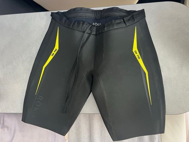 Neopreno Roka SIM PRO en color negro con detalles amarillos. - Talla M - Diseño con líneas amarillas. - Marca Roka visible. - Cordón ajustable en la cintura.