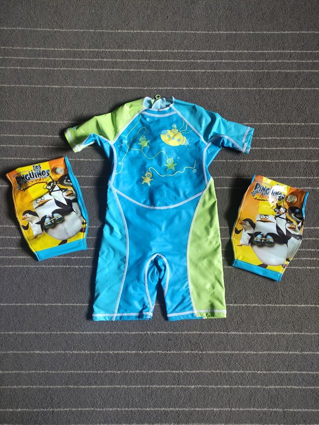 Detalles del productoConjunto de neopreno y manguitos para niño de 4 años con diseño de Los Pinguinos.