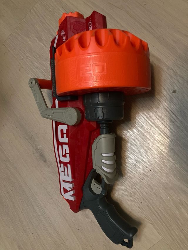 Lanzador de dardos Nerf Megalodon con tambor para 20 dardos. - Color rojo y naranja. - Incluye mango de cebado. Funcional sin baterías
