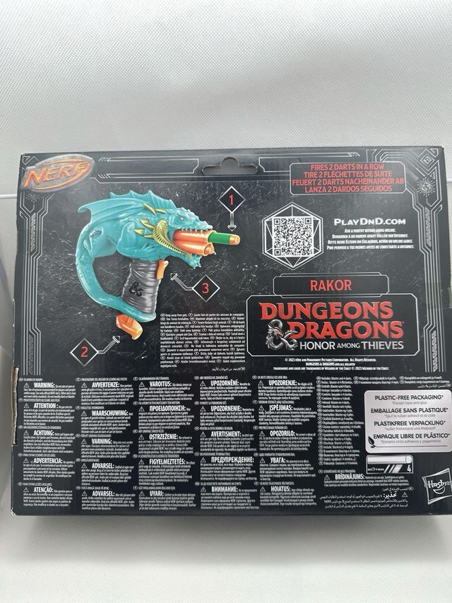 The Dungeons & Dragons Rakor Blaster está inspirado en la película Dungeons & Dragons: Honor Among Thieves y el juego de rol D&D. Con el lanzador de dardos Rakor con el aspecto del dragón negro, se pueden disparar 2 dardos seguidos. Un gran blaster de juguete para juegos imaginativos al aire libre. El lanzador de dragones viene con 4 dardos Nerf Elite, por lo que hay 2 dardos disponibles para cargar y otros 2 dardos para recargar. Se puede iniciar una batalla llena de acción en interiores o exteriores ..