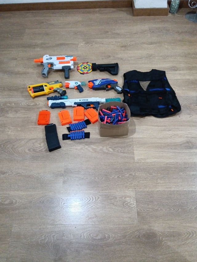 Detalles del productoSet de juguetes Nerf en buen estado. Incluye varias pistolas Nerf y X-Shot, chaleco táctico, numerosos dardos y cargadores. Ideal para juegos de acción. - 7 pistolas Nerf y X-Shot de diferentes modelos. - 1 chaleco táctico. - Numerosos dardos (rojos y azules). - Varios cargadores.