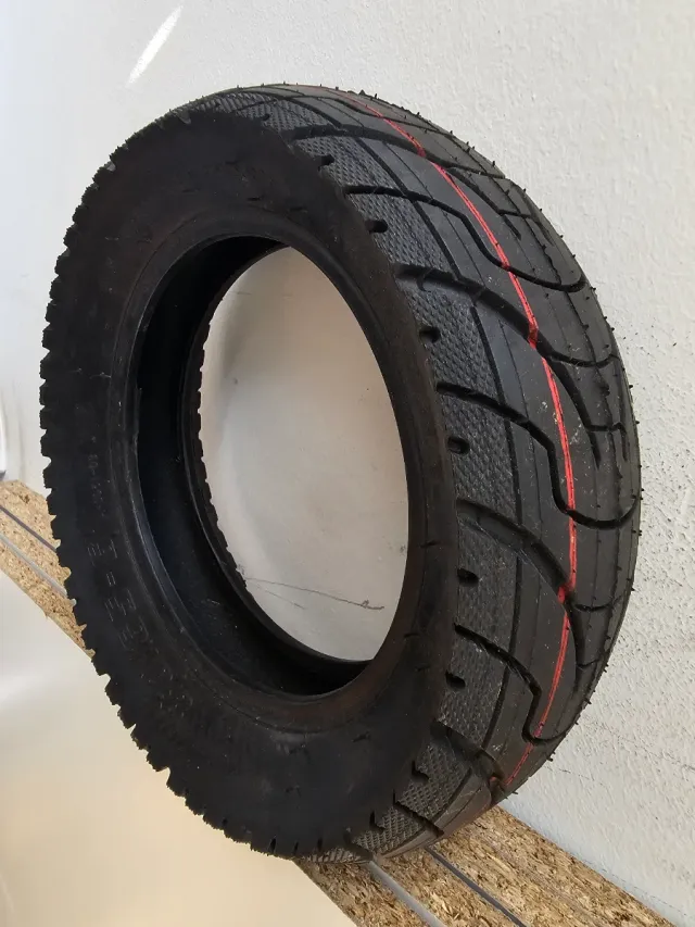 Detalles del productoNeumático de patinete eléctrico con un diseño moderno y banda de color rojo.