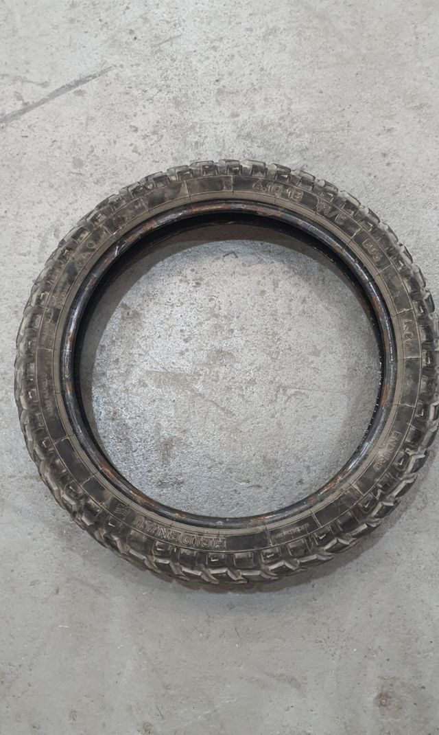 Neumático mixto para moto, ideal para uso en carretera y caminos. Trasero 4.10×18 Delantero 2.75x21 25€ cada uno. Todavía le queda mucho uso