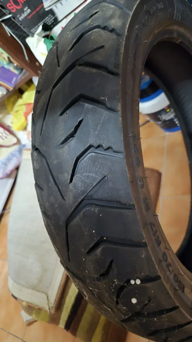 Neumático de carretera para moto, en buen estado. - Medida: 150/70 R17. - Diseño optimizado para carretera.