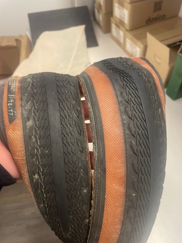 Detalles del productoSe venden neumáticos de gravel en buen estado, con un diseño bicolor en naranja y negro.