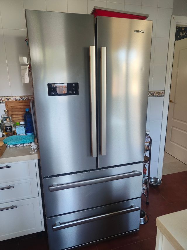 Detalles del productoNevera americana de la marca Beko, con acabado en acero inoxidable.