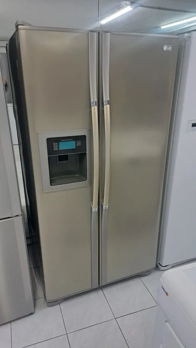 Detalles del productoNevera americana de la marca LG en acabado de acero inoxidable. Dispone de dispensador de agua y hielo en la puerta.