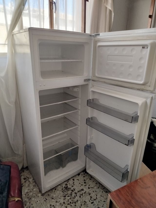 Nevera blanca de dos puertas, ideal para cocinas pequeñas o como frigorífico auxiliar. - Compartimento congelador superior. - Estantes interiores. - Cajones para verduras.