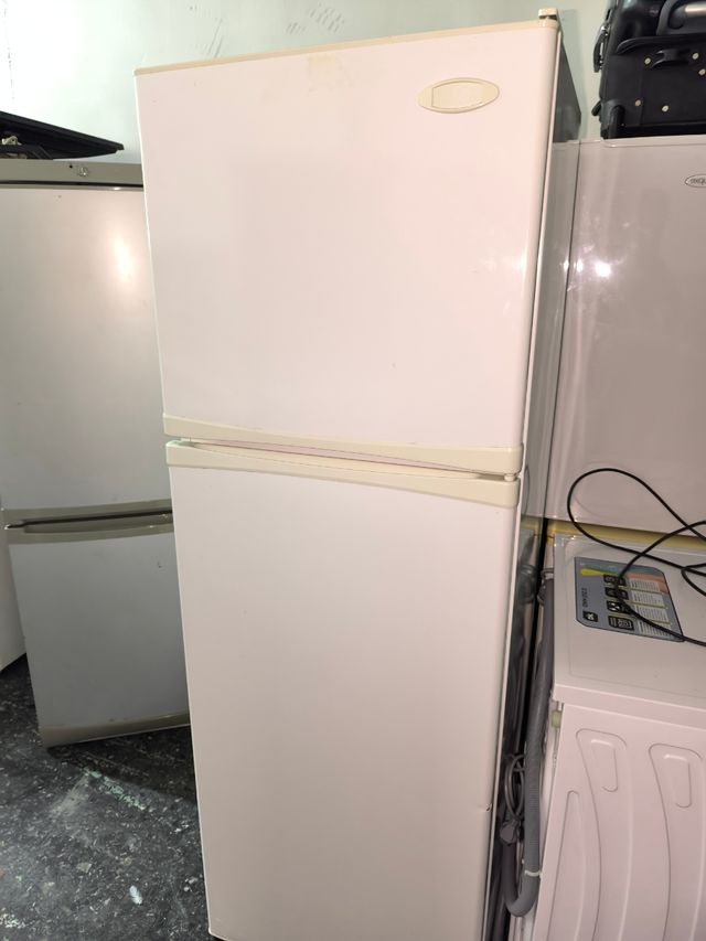 Nevera de color blanco. - Diseño de dos puertas. - Tirador ovalado en la parte superior.