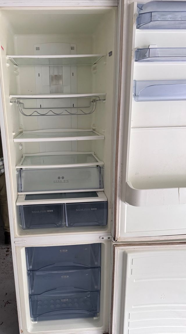 Detalles del productoNevera blanca con varios compartimentos y cajones.