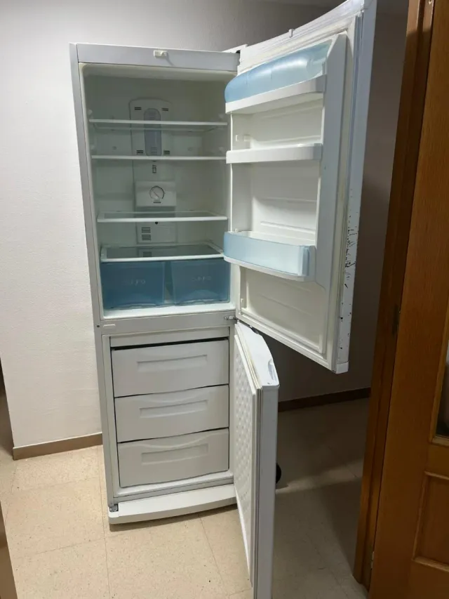 Detalles del productoNevera de color blanco con varios compartimentos y cajones. Está en perfecto funcionamiento tanto el frigo como el congelador, la puerta está rayada pero se le puede colocar un vinilo.