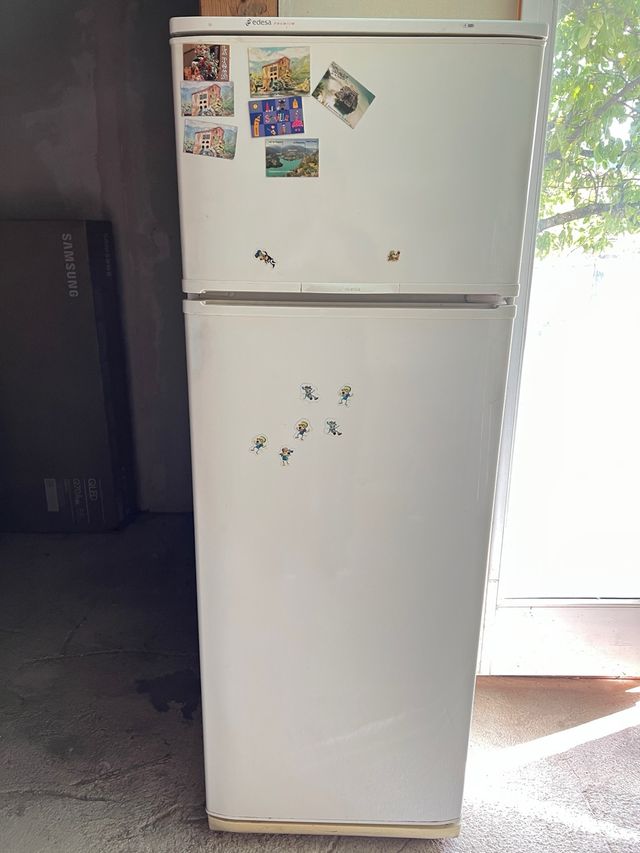 Detalles del productoNevera blanca de dos puertas, ideal para cocinas o espacios de almacenamiento.