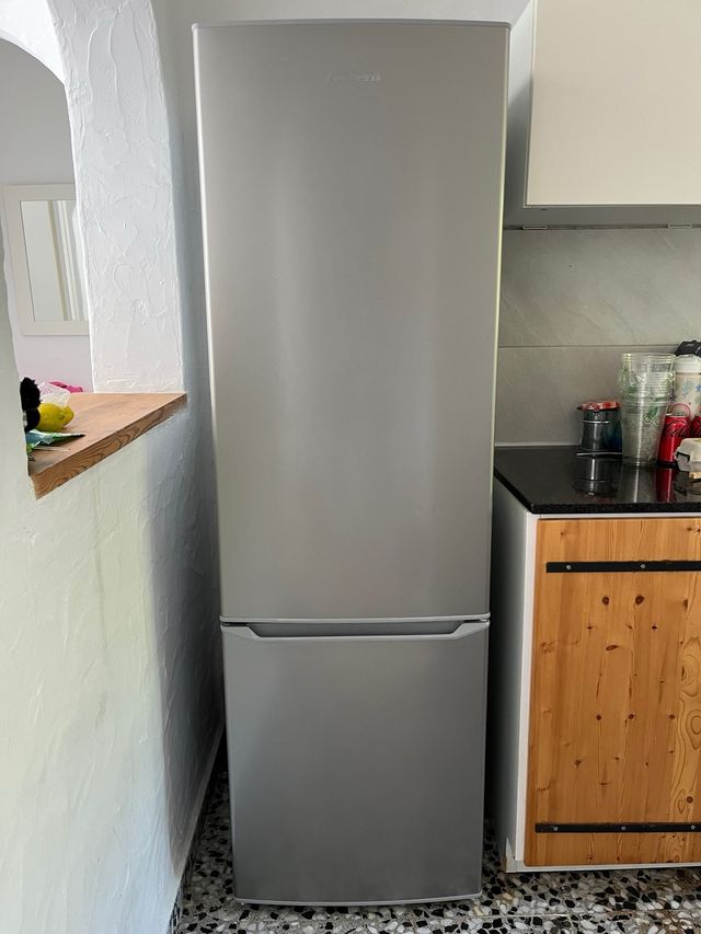 Detalles del productoNevera combi marca Corbero de color plateado, con congelador en la parte inferior.