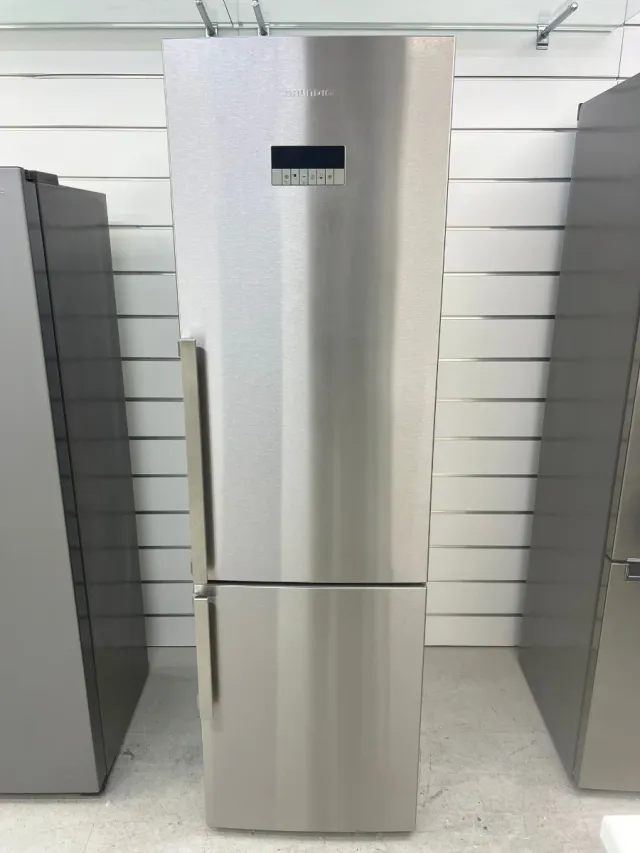 Detalles del productoNevera combi de la marca Grundig, con acabado en acero inoxidable.