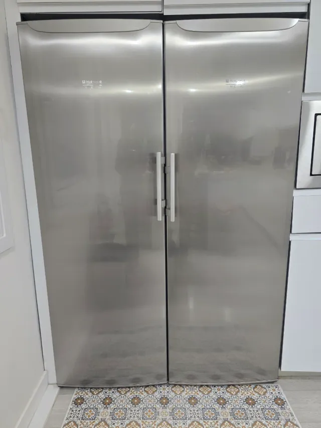 Detalles del productoNevera combi de la marca Hotpoint con acabado en acero inoxidable.