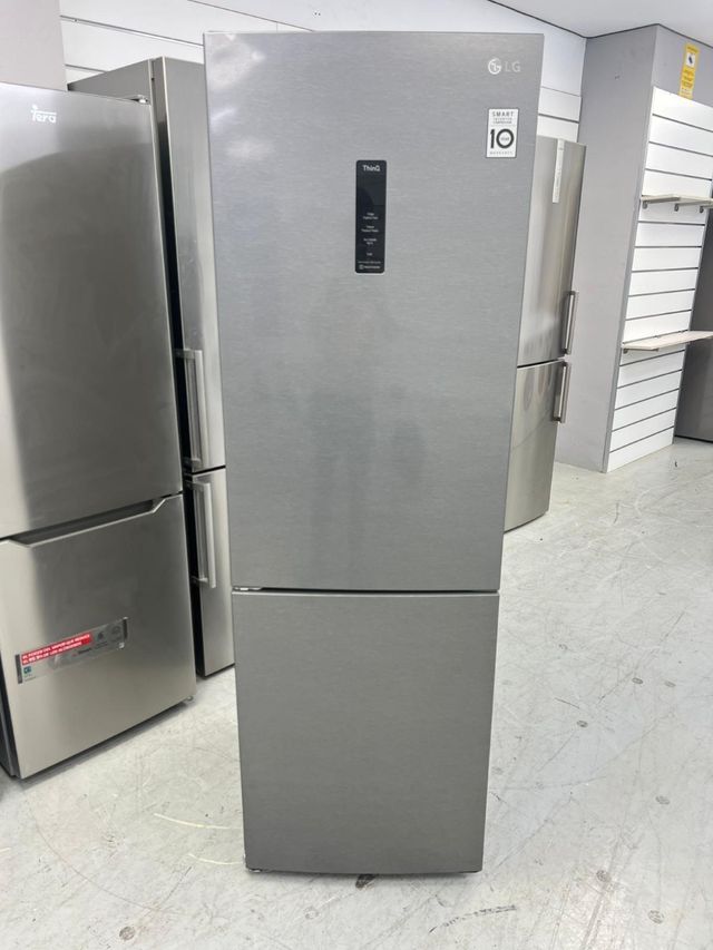 Detalles del productoNevera combi de la marca LG con tecnología ThinQ. Diseño moderno en acabado plateado.
