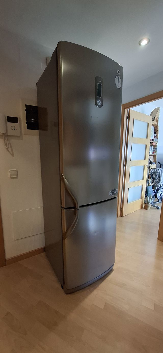 Detalles del productoNevera combi LG con acabado en acero inoxidable. Dispone de congelador en la parte inferior.