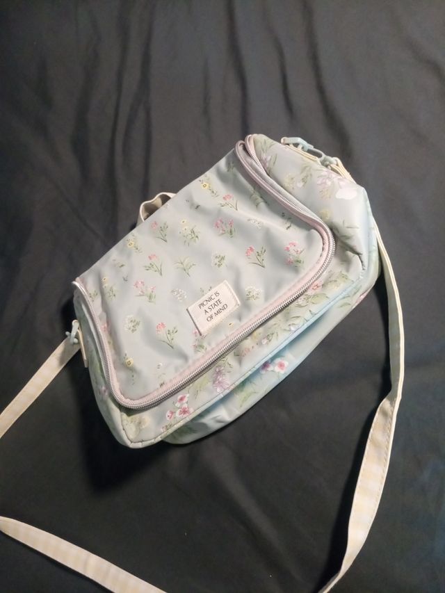 Práctica nevera de playa con un bonito estampado floral. - Diseño con flores pequeñas en tonos pastel. - Asa para colgar. - Cierre de cremallera.