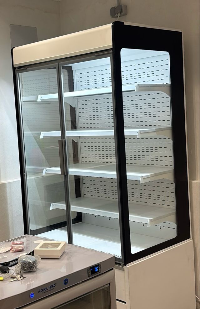 Nevera expositora con dos puertas de cristal. - Diseño moderno y funcional. - Amplio espacio interior. - Estantes ajustables. - En perfecto estado