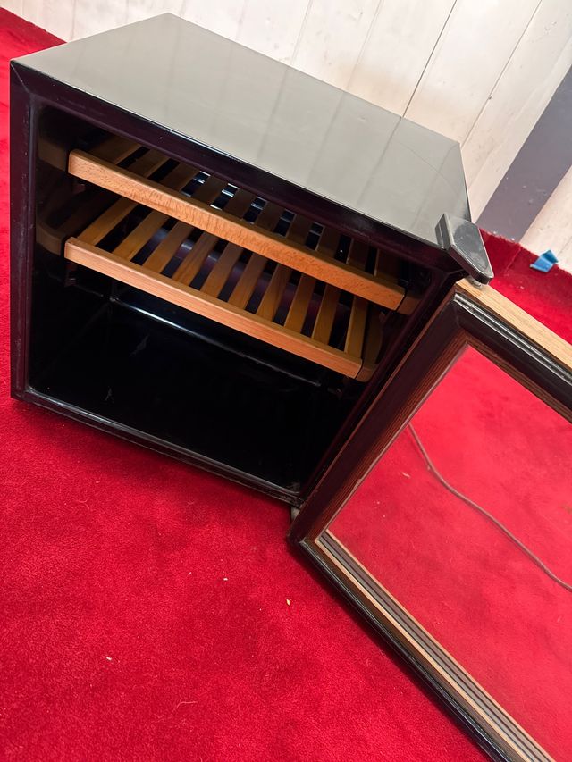 Detalles del productoNevera expositora de color negro con estantes de madera.