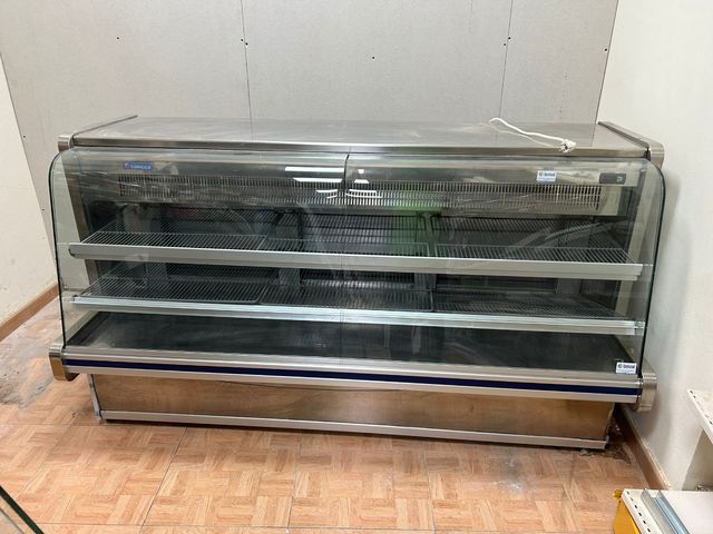 Nevera expositora refrigerada con diseño moderno y cristal curvo. - Estructura de acero inoxidable. - Múltiples estantes. - Puerta de cristal.