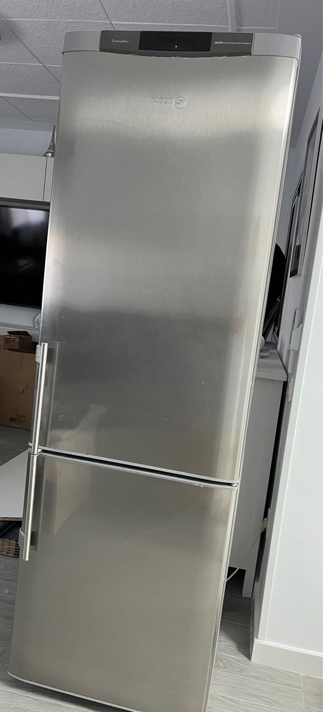 Detalles del productoNevera combi de la marca Fagor con acabado en acero inoxidable. Cuenta con dos puertas y un diseño moderno.