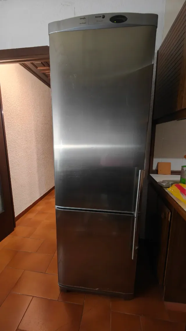 Detalles del productoNevera combi de la marca Fagor con acabado en acero inoxidable.