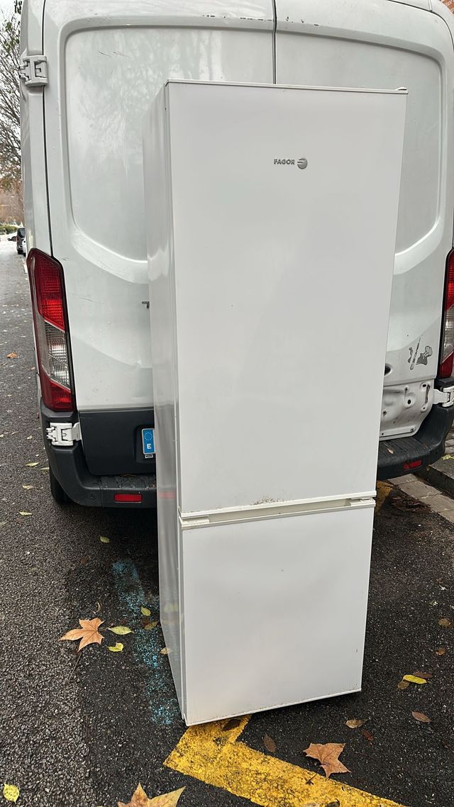 Nevera Fagor de color blanco. Cuenta con dos puertas, una para el frigorífico y otra para el congelador. - Diseño vertical. - Marca Fagor.