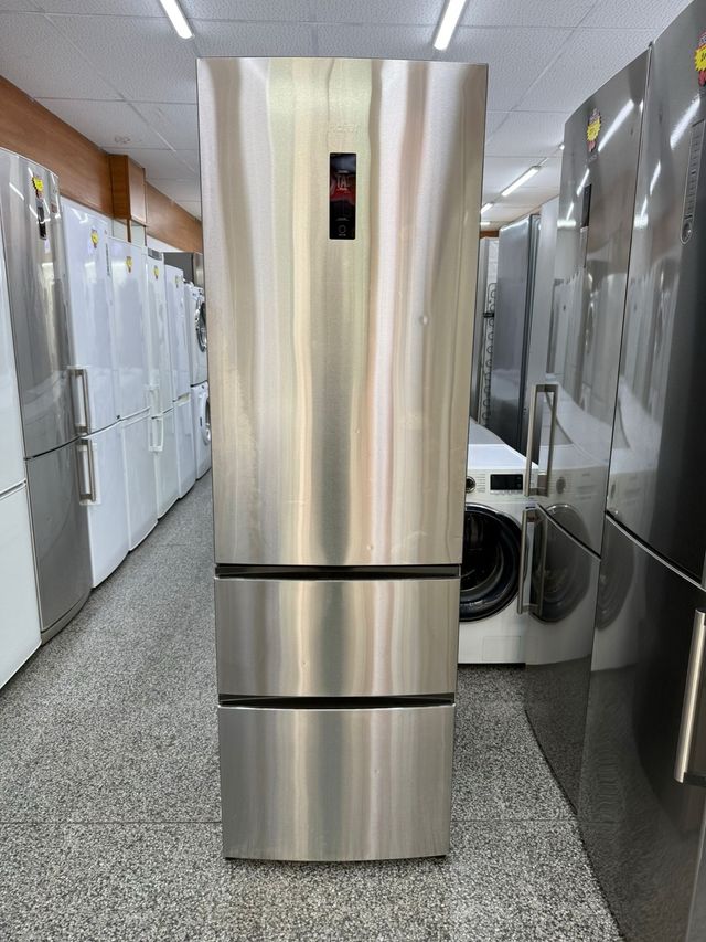 Detalles del productoNevera marca Haier con tecnología No Frost. Diseño moderno en acero inoxidable.