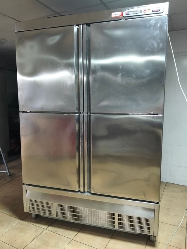 Detalles del productoNevera profesional de hostelería con cuatro puertas. Fabricada en acero inoxidable, es robusta y fácil de limpiar.