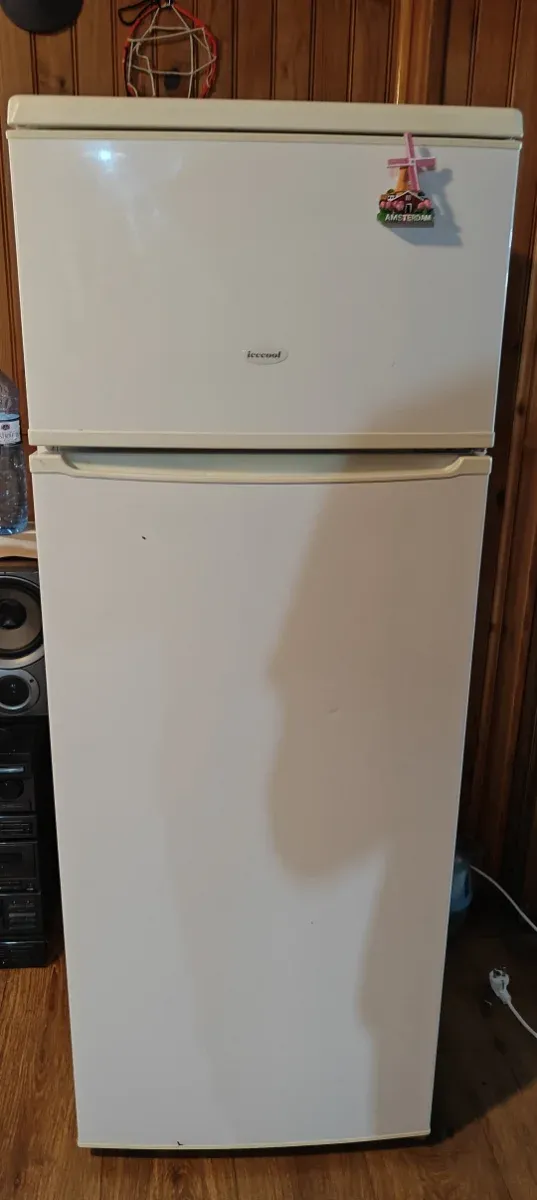 Detalles del productoNevera de dos puertas en color blanco. La parte superior es el congelador y la inferior es el frigorífico.