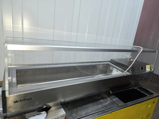 Nevera de la marca Infrico, ideal para establecimientos de hostelería. - Construcción en acero inoxidable. - Encimera de cristal. - Diseño moderno y funcional.