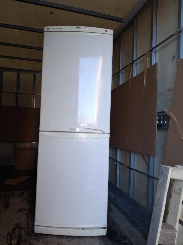 Detalles del productoNevera de la marca LG en color blanco. Cuenta con dos puertas, una superior para el congelador y otra inferior para el frigorífico.