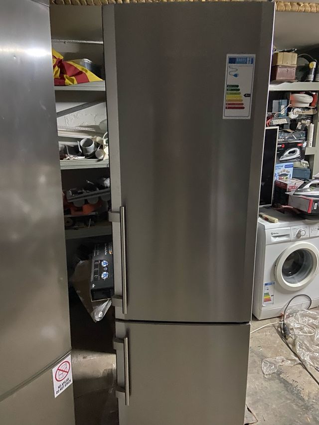 Detalles del productoNevera combi de acero inoxidable con dos puertas.
