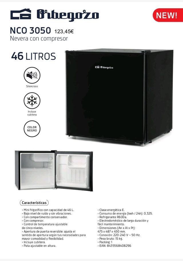 Detalles del productoMini frigorífico Orbegozo NCO 3050 en color negro y con capacidad de 46 litros. Ideal para espacios reducidos.