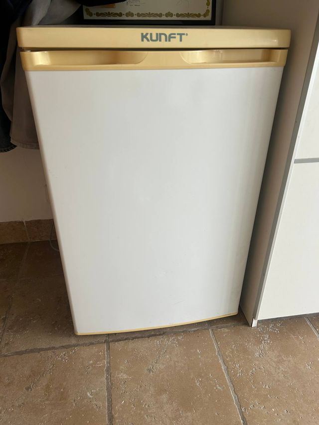 Nevera compacta de la marca Kunft. Ideal para espacios reducidos. - Color blanco. - Diseño moderno con detalles en color dorado.