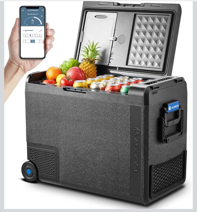 Nevera portátil eléctrica de 58 litros con ruedas. Congelación o refrigeración de 20 a -20 °C. Modos ECO y MAX. Tiene 2 compartimentos, el grande de 47L y el pequeño de 11L.