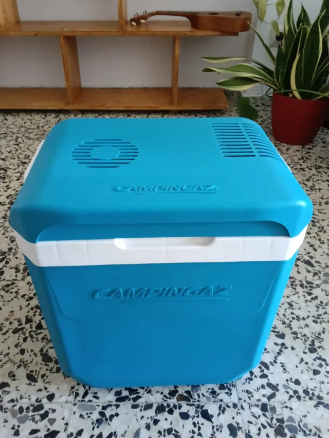 Nevera electrica portátil de 25 litros de la marca Campingaz en color azul. Ideal para mantener tus bebidas y alimentos frescos.