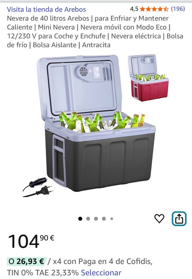 Detalles del productoNevera portátil de 40 litros, ideal para mantener tus bebidas frías o calientes. Funciona con conexión de 12/230 V, perfecta para el coche o enchufe doméstico. Incluye modo Eco y bolsa aislante.