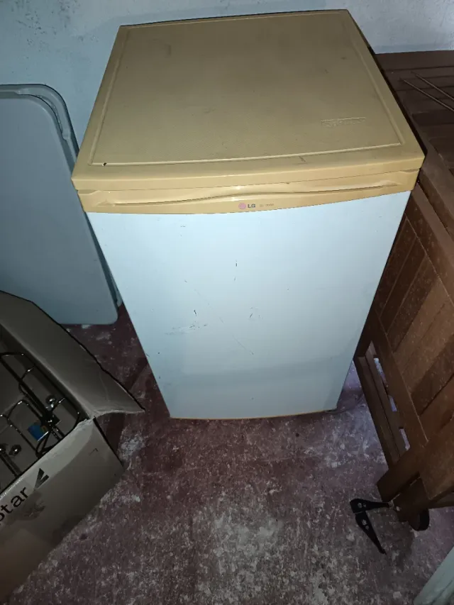 Nevera portátil de la marca LG, ideal para camping o viajes. - Color blanco y tapa beige. - Diseño compacto.