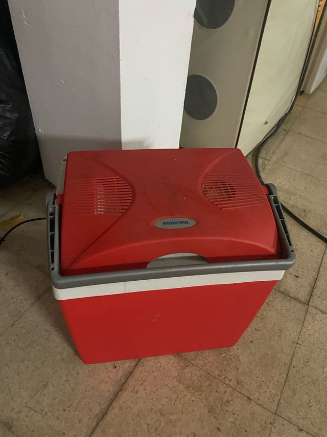 Nevera portátil de color rojo con tapa gris y blanca. - Asa integrada para facilitar el transporte. - Diseño compacto y funcional.