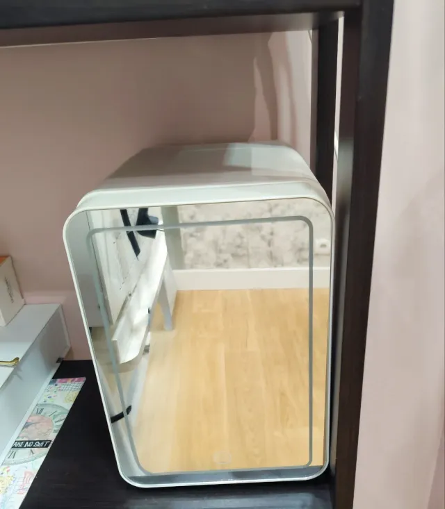 Nevera portátil de tamaño compacto, ideal para llevar tus bebidas. - Diseño moderno y funcional. - Color blanco. - Bebidas o cosmética -Espejo y luz