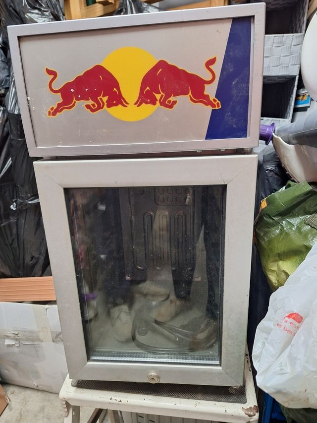 Nevera de la marca Red Bull con diseño icónico. - Parte superior con logo de Red Bull. - Puerta de cristal. - Marco plateado.