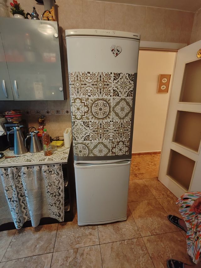 Detalles del productoNevera Samsung de color blanco con un diseño decorativo en la parte superior.