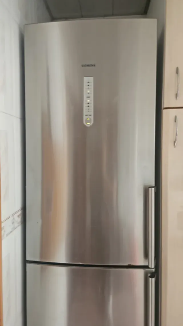 Detalles del productoNevera Siemens de color plateado, con un diseño moderno y elegante.