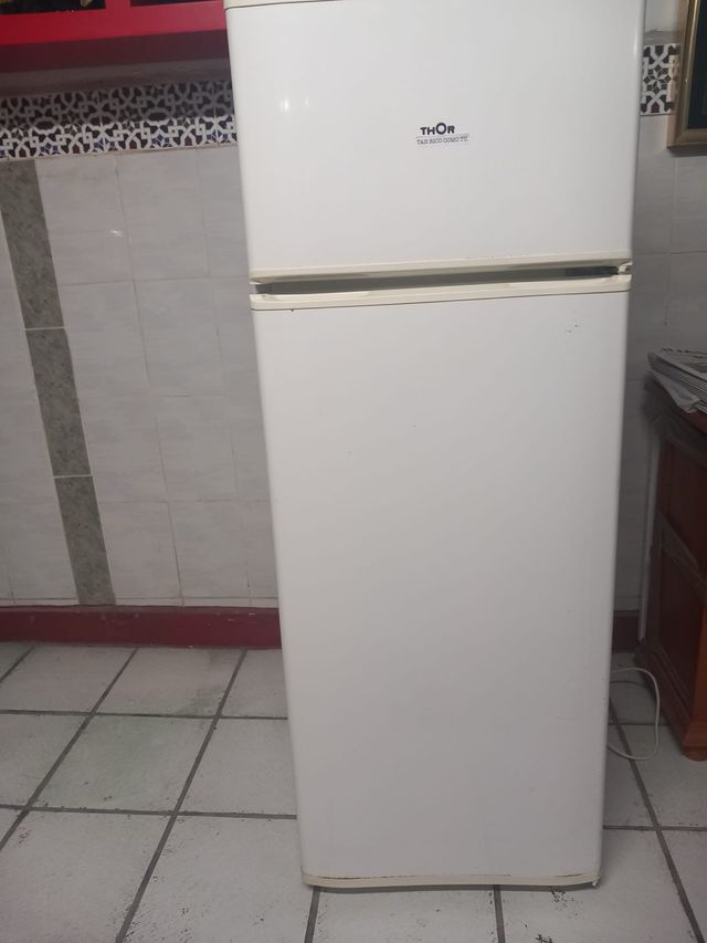 Nevera de dos puertas de la marca Thor. - Color blanco. - Diseño clásico de frigorífico y congelador superior.