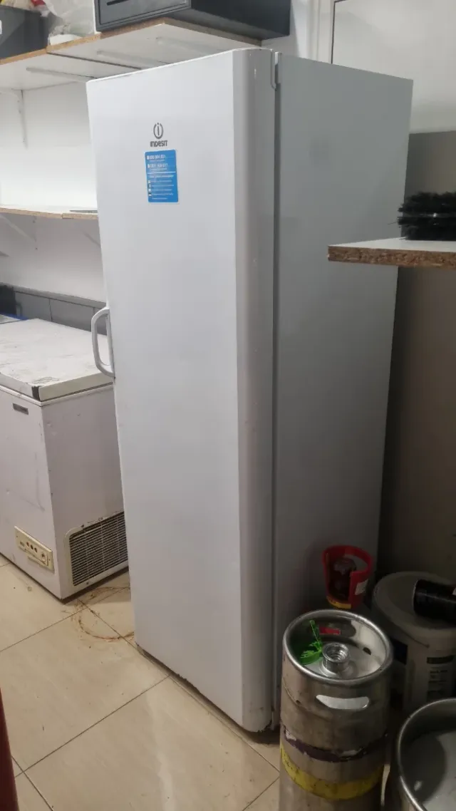 Nevera vertical de color blanco. - Diseño moderno y funcional. - Asa integrada para fácil apertura. - Etiqueta informativa en la puerta.