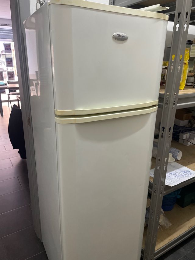 Nevera Whirlpool de color blanco, con congelador superior. - Diseño clásico de dos puertas. - Marca Whirlpool.